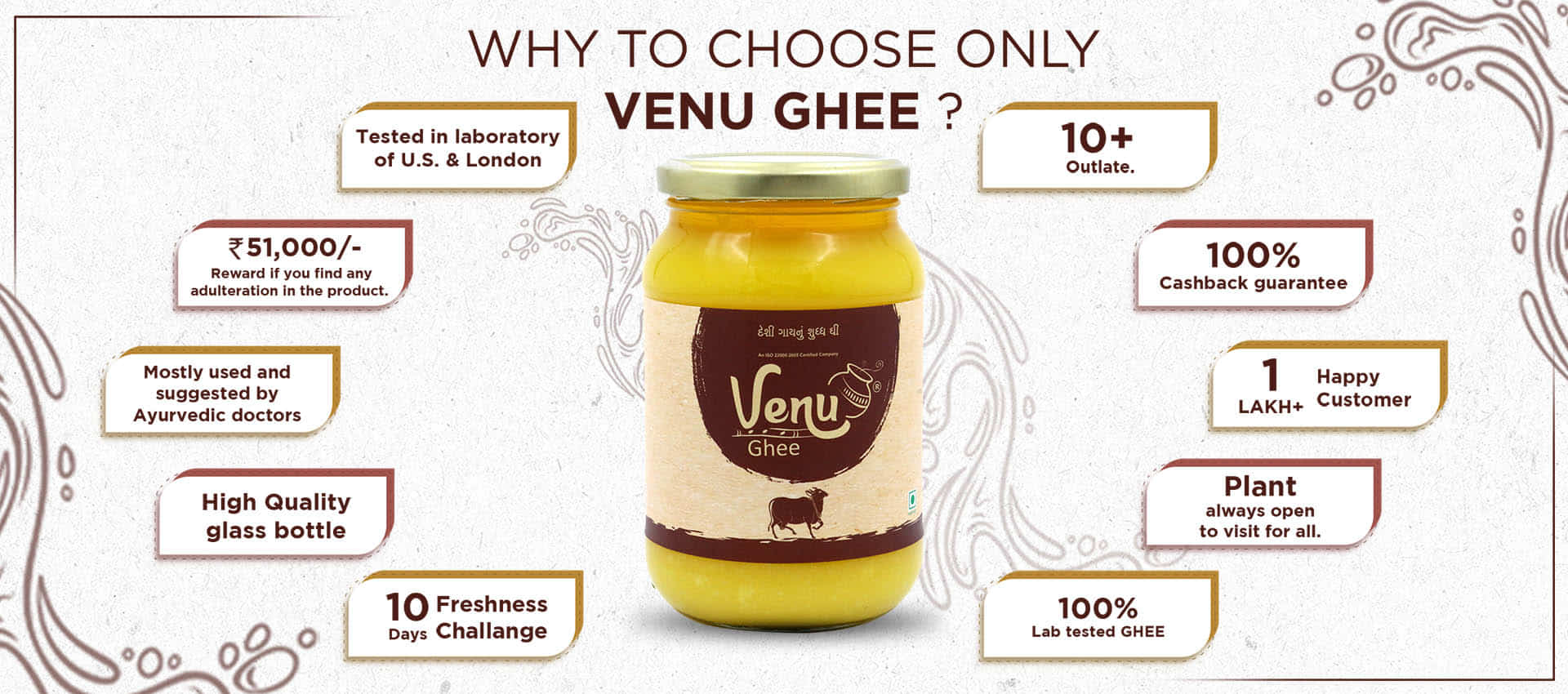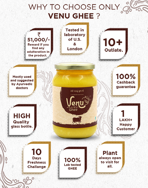 • Everyone knows about the benefit of pure desi ghee But ghee only benefit you if it is pure. and only venu ghee gives complete safety standard of quality. and takes complete responsibility.